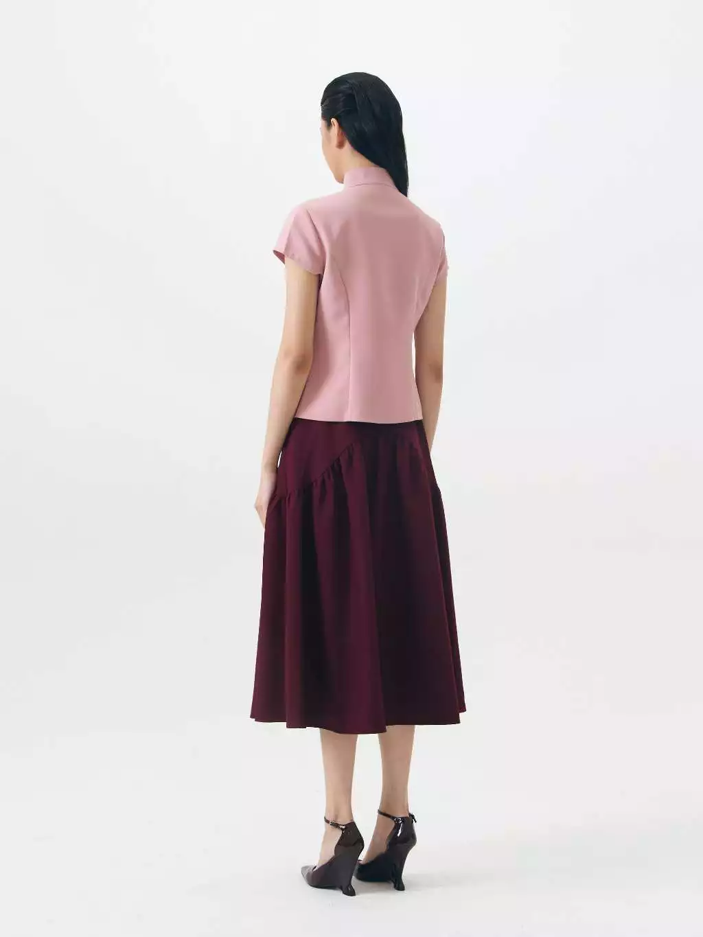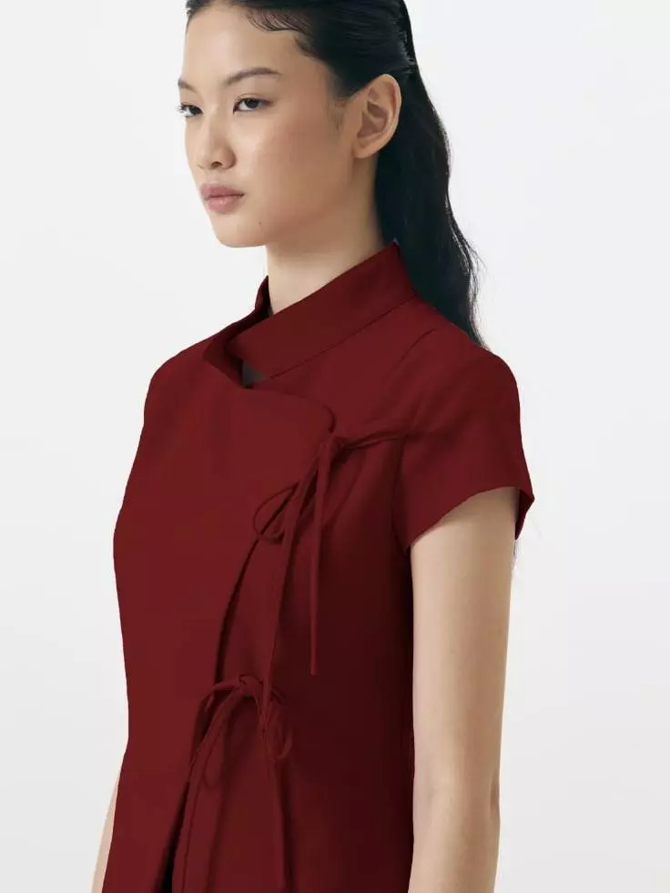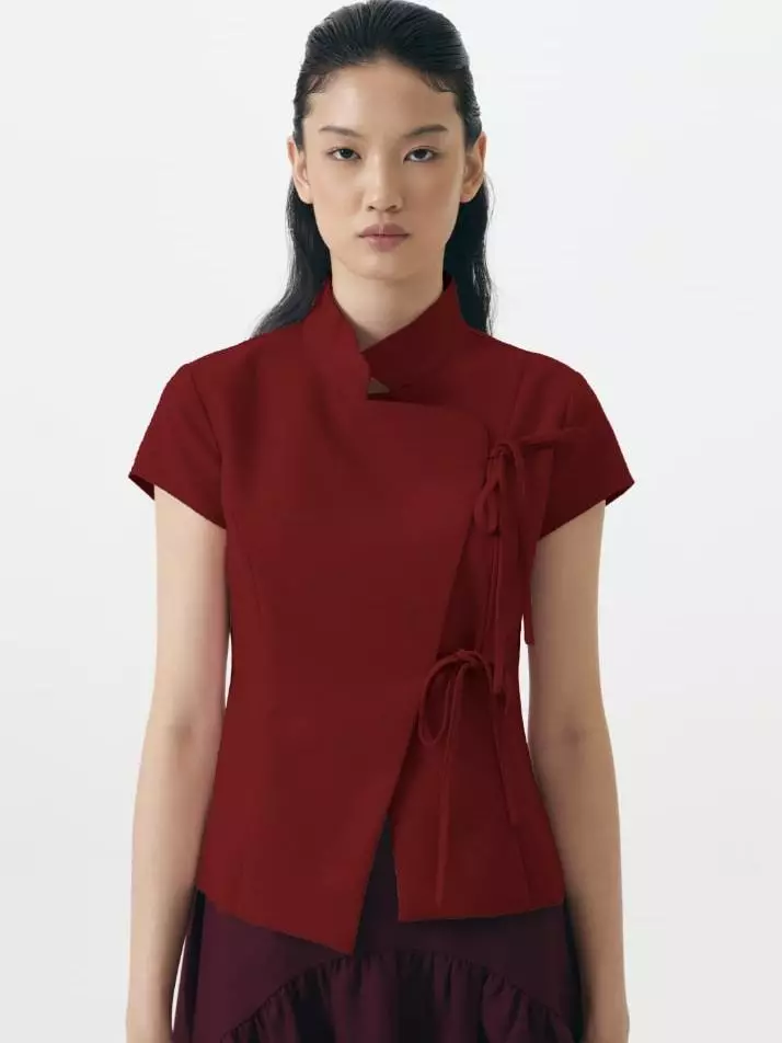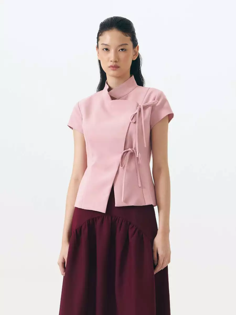 This Asymmetric Tie-Front Blouse offers a contemporary take on traditional wrap silhouettes. The top features a sculptural high neckline and a clean-lined, overlapping front panel. Cut with short, capped sleeves and a slightly tailored waist.