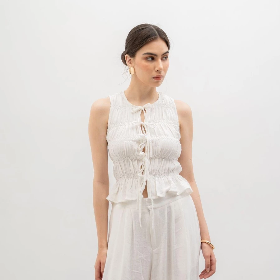 * Atasan wanita dengan desain vest linen yang elegan. Cocok untuk gaya Korea yang modern.